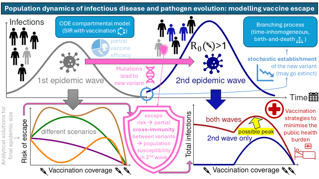 My PhD thesis ‘Population dynamics of infectious disease and pathogen evolution: modelling vaccine escape’ (2025) is available here, including a technical abstract (an extended summary is available here). Below is a graphical abstract and a ‘lay summary’ for the general reader.